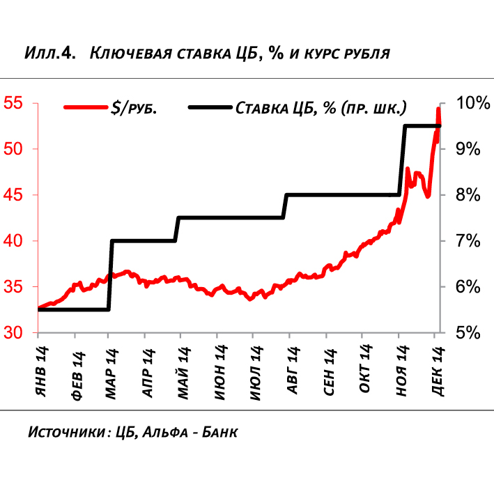Кредитный канал не принес ожидаемого результата. Удивительно, но повышение ключевой ставки на 400 б. п. в этом году не принесло ожидаемого результата через кредитный канал. Несмотря на повышение ставок по корпоративному кредитованию, рост кредитов в рублях в октябре не замедлился в сравнении с январем, составив 12% г/г, а рост розничных депозитов в рублях замедлился с 16% г/г в январе до 6% в октябре. Это особенно удивительно, так как ЦБ действовал согласно «принципу Тейлора»: повышал ключевую ставку быстрее, чем ускорялась инфляция в 2014 г.